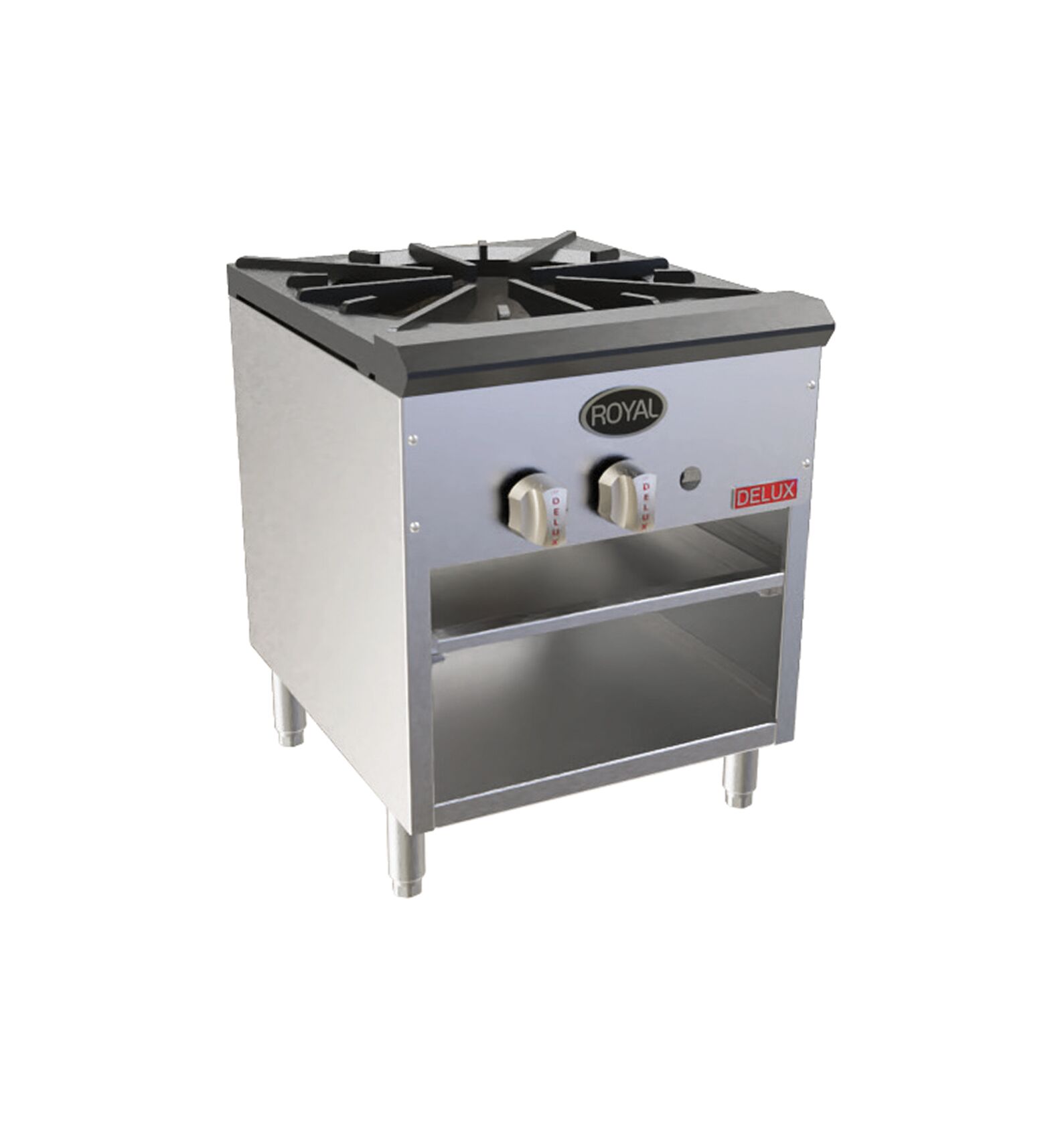 Delux Series, Stock Pot Range, (1) three ring burner (2 center rings rated at 50,000 BTU with control, outer ring rated at 50,000 BTU with control), cast iron top, manual controls, stainless steel cabinet base, stainless steel valve cover, 6″ legs with adjustable feet, 100,000 BTU, cCSAus, CSA-Sanitation