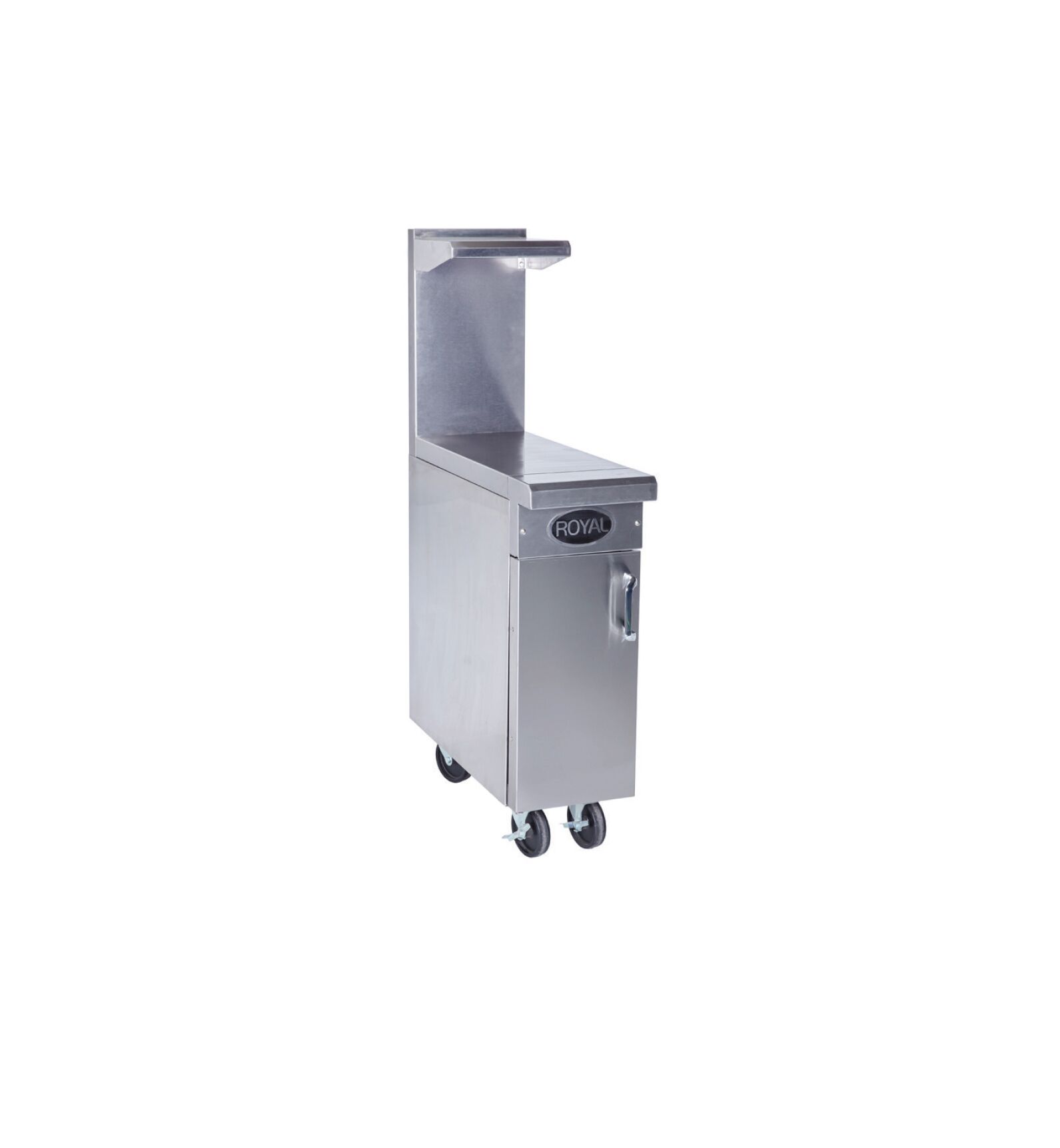 Spreader Work Surface Range Match, 12″, stainless steel front and sides including backguard and high shelf, 6″ legs, NSF, Made in USA