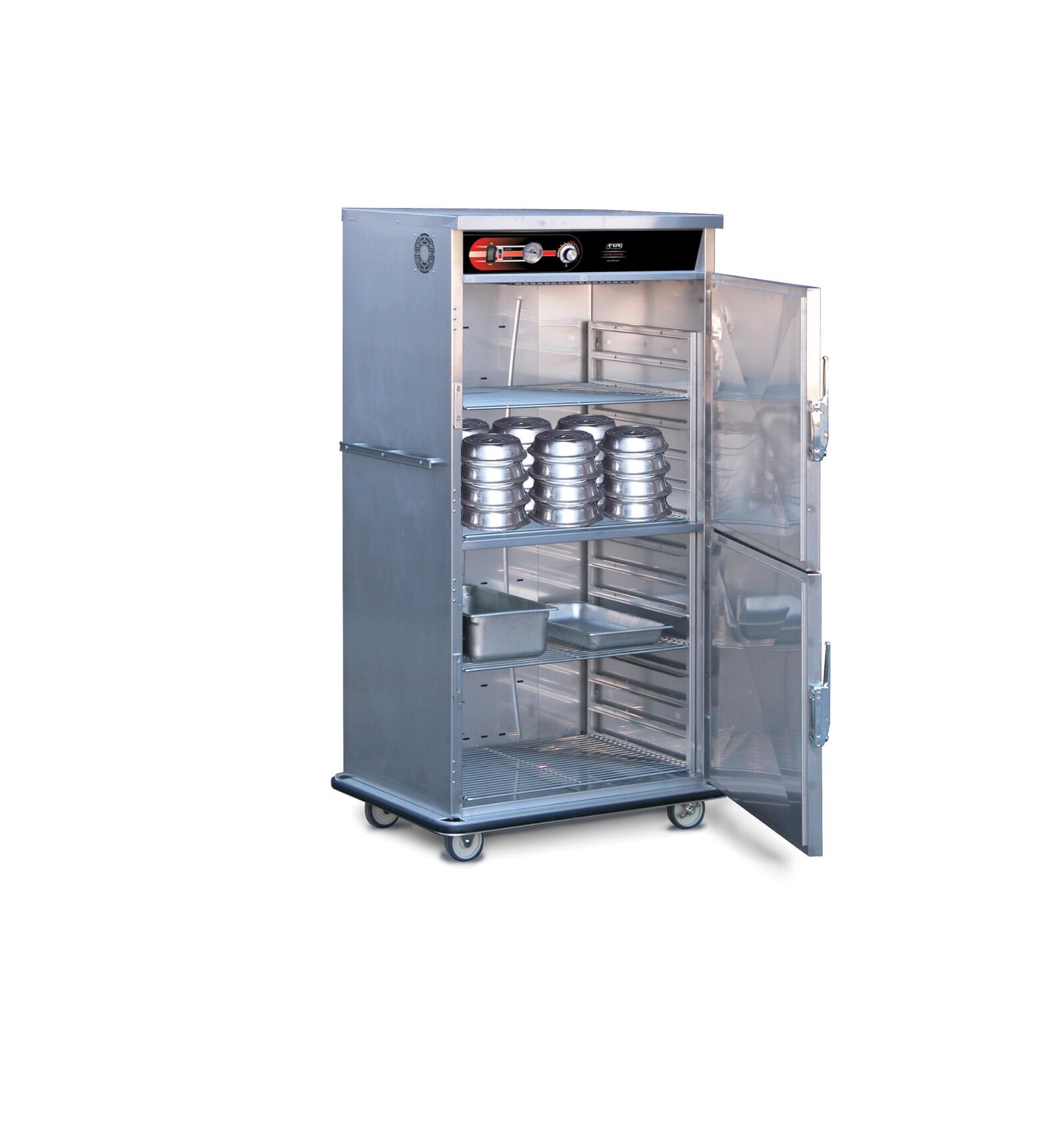 Built-In Top Mount Heat System Versatile banquet cabinet features adjustable shelves. 15 sets of rails (on one-piece removable rack) allow for multiple shelf positions. Sized to accommodate covered plates up to 10.5″ diameter (to achieve maximum capacity). Rails also sized to fit 2 pans per shelf: GN 1 / 1 – 65 mm or 12” x 20” x 2.5”. Capacity of 30 pans on shelves.4 Shelves provided. Heat is gently circulated throughout the cabinet to keep pre-plated meals hot, fresh and flavorful for hours. Thermometer displays cabinet temperature at all times to assure food safety.