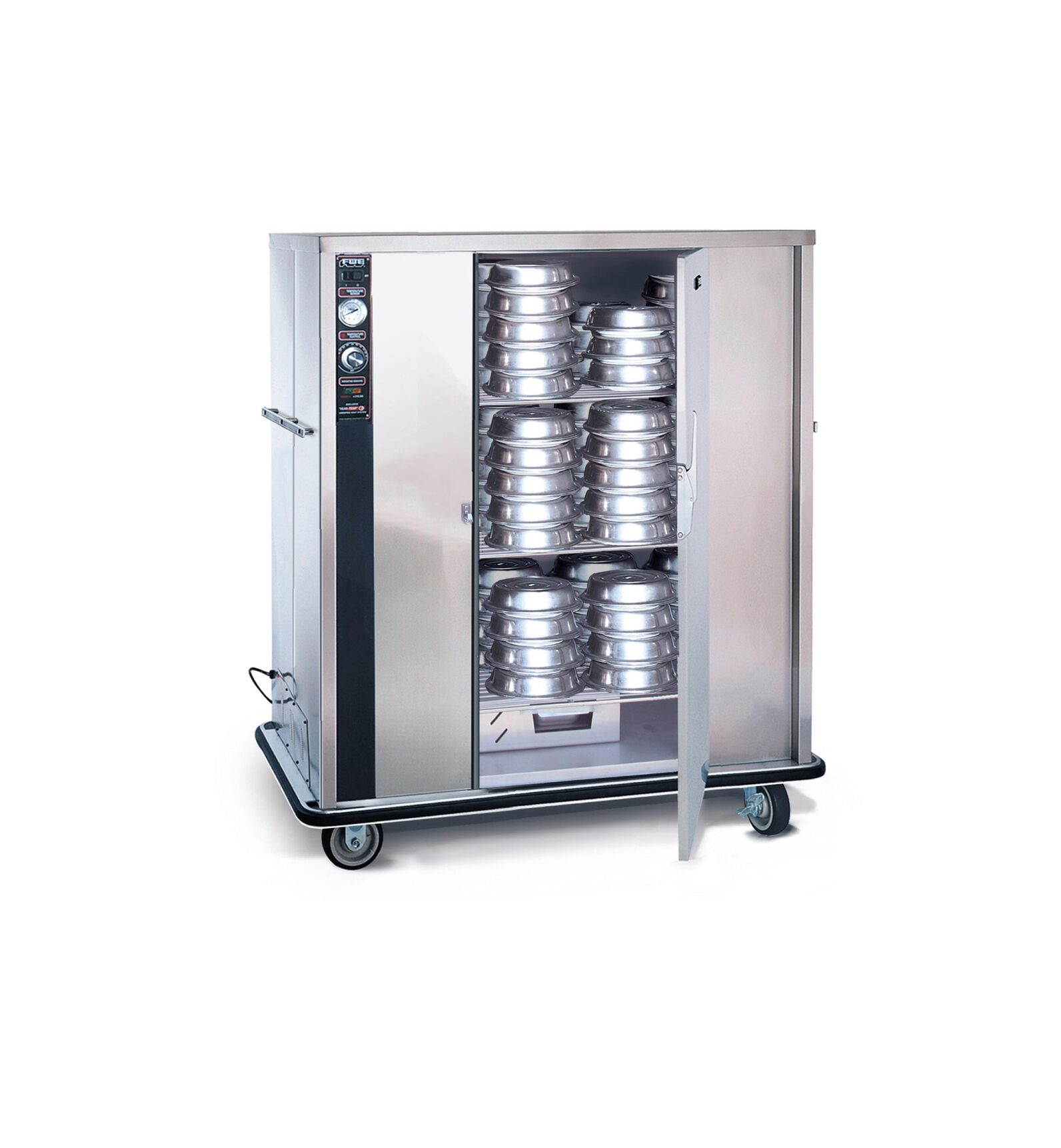 Humi-Temp Mobile Banquet Cabinet For those who prefer two (2) side-by-side cabinet doors designed for full-reach-in when loading and unloading covered plates. Heated holding cabinet sized to stack and nest covered plates up to 11″ diameter (to achieve maximum capacity). Humi-Temp heat system preconditions the cabinet with low humidity.Heat is distributed evenly throughout the cabinet to keep pre-plated meals hot, fresh and flavorful for hours. Thermometer displays cabinet temperature at all times to assure food safety. Comes standard with a six (6) caster configuration for tight maneuvering.