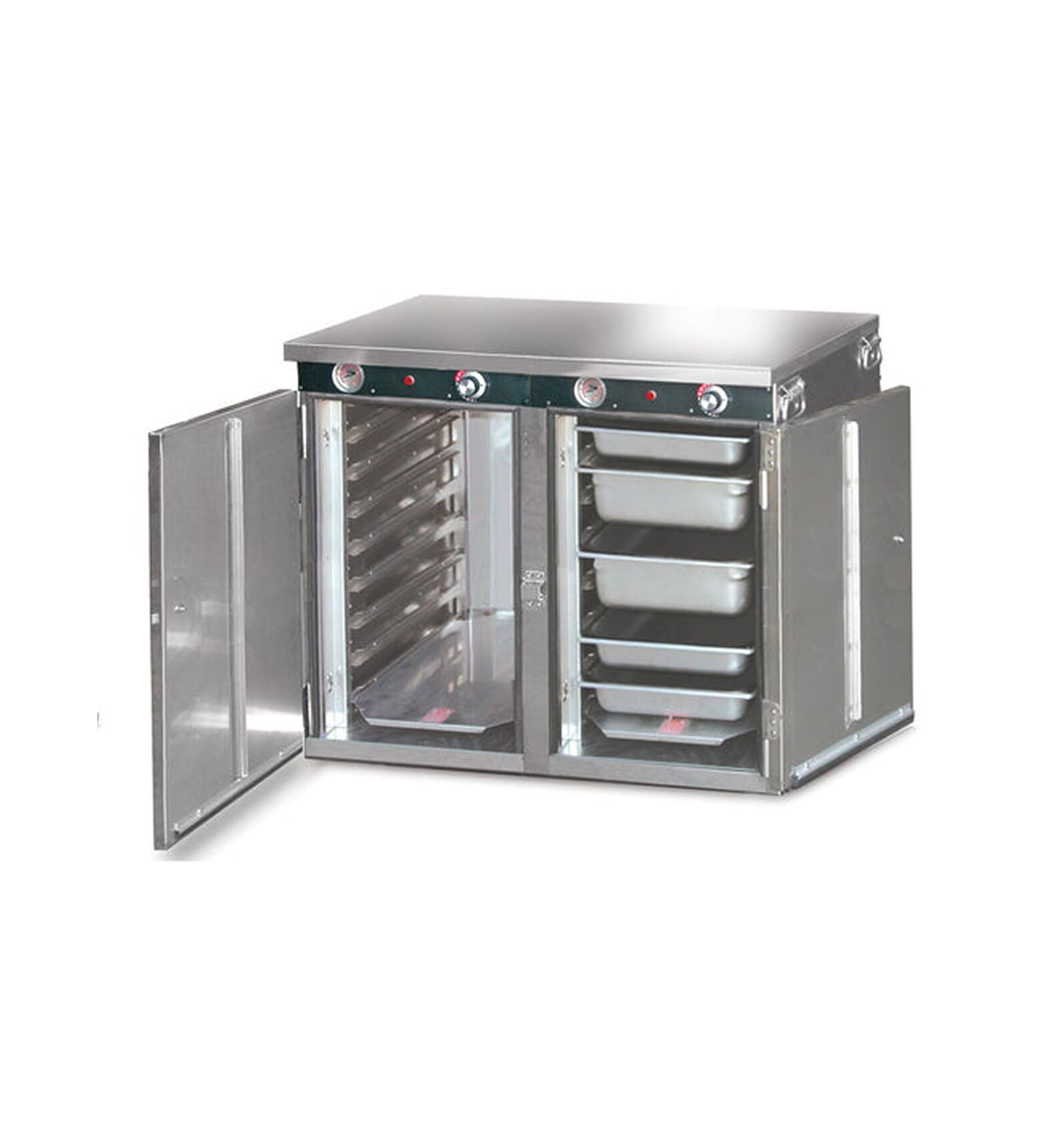 Handy Line Compartments Transport, Stacking, or Built-In Compartments (No Caster Model) For 12″ x 20″ and Gastro-Norm 1/1 Bulk Food Pans There’s no limit to the versatility of these handy stackable heated compartments. Mix and match sizes allow you to stack them to suit your capacities. Simple and dependable heat system holds bulk foods “kitchen-fresh” for hours.These compact units are durable and convenient for transport. Thermometer displays compartment temperature at all times to assure food safety. Perfect for built-in applications! Pan Server Accommodates: (1) 12″ x 20″, (1) Gastro-Norm 1/1 pans. Combinations of deep and shallow pans may be used with varying capacities. The front edges are relieved for easy loading. Pair of racks are removable for easy cleaning.