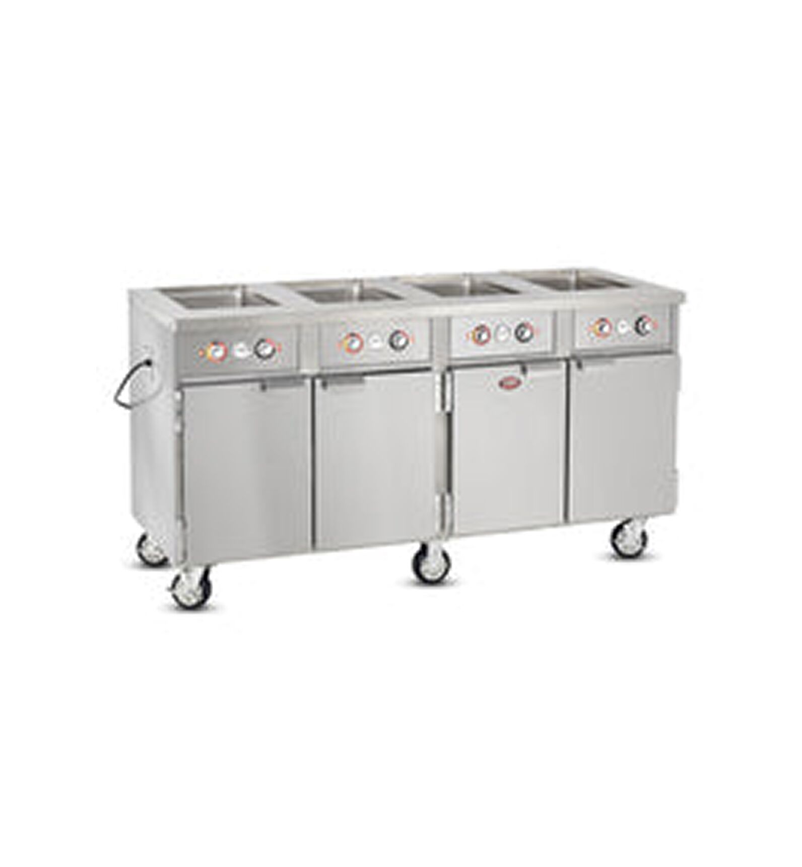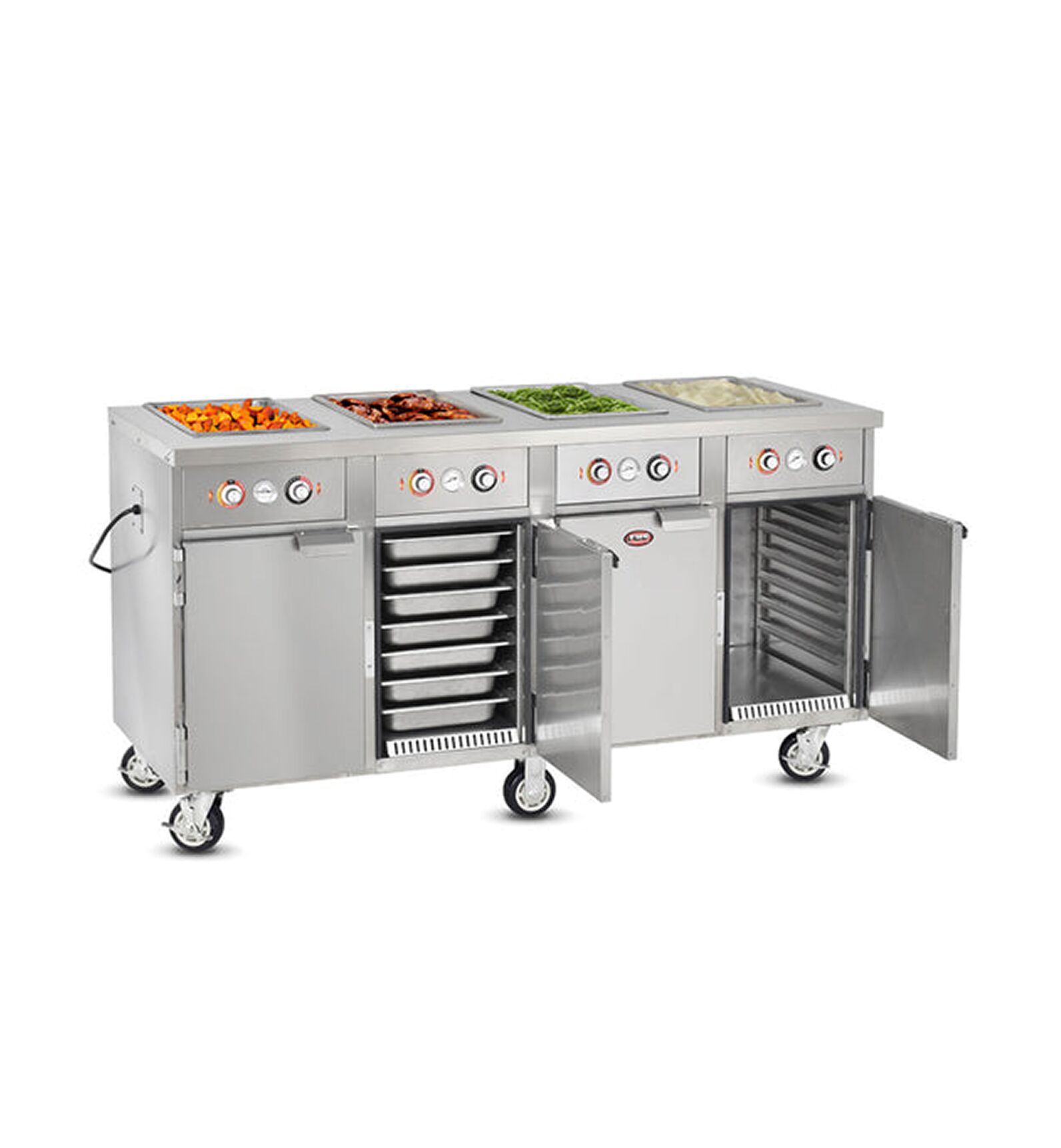 Mobile Heated Serving Line Serving Wells and Heated Compartments for 12″ x 20″ and GN 1/1 Bulk Food Pans. Heavy duty, mobile server takes the food whenever and wherever it needs to go! Individually heated holding compartments for 12″ x 20″ and GN 1/1 pans make resupply of the top wells quick and easy for serving applications, allowing transport of your foodservice complete.For cafeterias, buffets, schools, prisons or buffet style applications in restaurants, institutions, or other demanding environments, customize your server with a drop down shelf and sneeze guard to serve your food oven fresh.