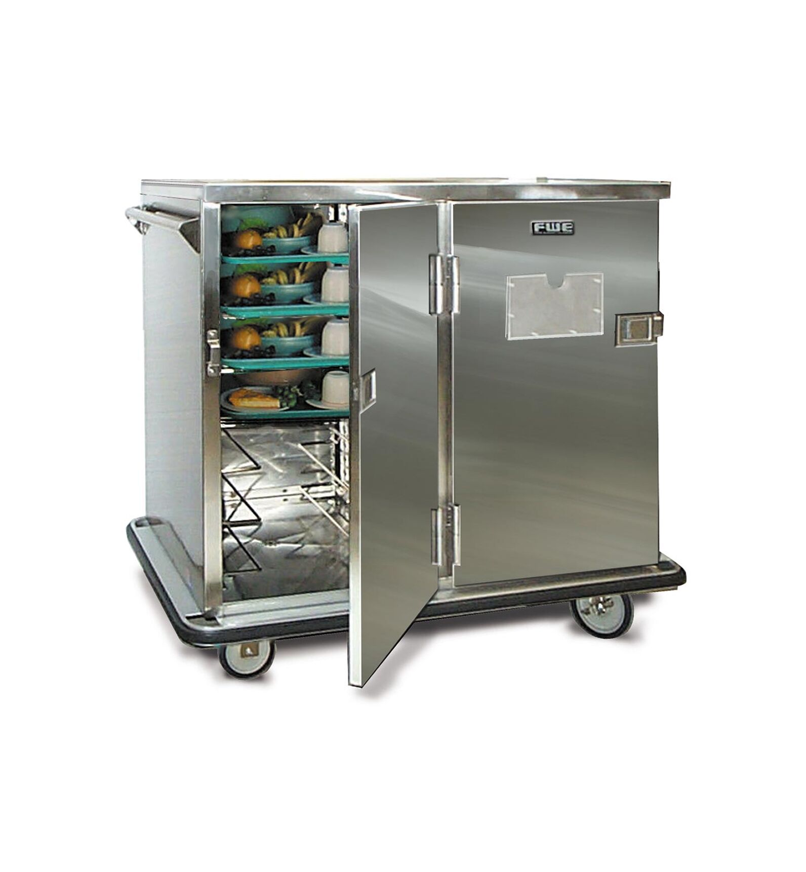 Rugged Patient Tray Transport – For 14″ x 18″, 15″ x 20″, or 16″ x 22″ Patient Trays. Non-heated, non-insulated, rugged patient tray transports in sanitary stainless steel. Easy to maintain and non-electrical! FWE’s heavy-duty patient tray cabinets are fully enclosed and designed for fast tray access. Built for mobility, FWE’s unibody construction keeps the cabinet balanced and stable during transport. Serve hot and cold foods together using pellet systems, insulated, or disposable containers. Complete meals can be prepared ahead of time, then easily transported to serving location. Our internal frame construction is designed to endure the most rigorous operations and environments, eliminating cabinet torquing during transport, assuring FWE cabinets last longer than any other – period! Durable stainless steel takes the abuse of transport applications and allows for sanitary maintenance. Casters are mounted to reinforcement plates for added durability and take the impact over thresholds. Built tough from stainless steel for continuous demanding use.
