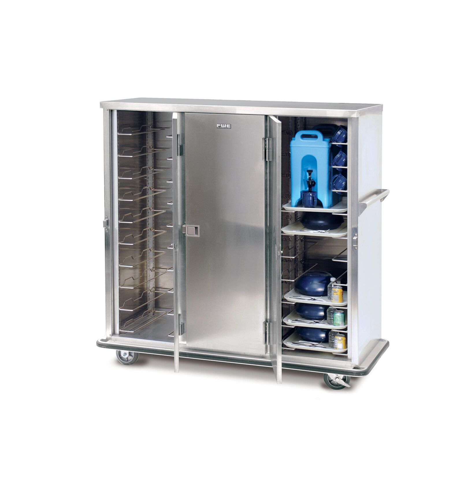 Rugged Patient Tray Transport – For 14″ x 18″, 15″ x 20″, or 16″ x 22″ Patient Trays. Non-heated, non-insulated, rugged patient tray transports in sanitary stainless steel. Easy to maintain and non-electrical! FWE’s heavy-duty patient tray cabinets are fully enclosed and designed for fast tray access. Built for mobility, FWE’s unibody construction keeps the cabinet balanced and stable during transport. Serve hot and cold foods together using pellet systems, insulated, or disposable containers. Complete meals can be prepared ahead of time, then easily transported to serving location. Our internal frame construction is designed to endure the most rigorous operations and environments, eliminating cabinet torquing during transport, assuring FWE cabinets last longer than any other – period! Durable stainless steel takes the abuse of transport applications and allows for sanitary maintenance. Casters are mounted to reinforcement plates for added durability and take the impact over thresholds. Built tough from stainless steel for continuous demanding use.