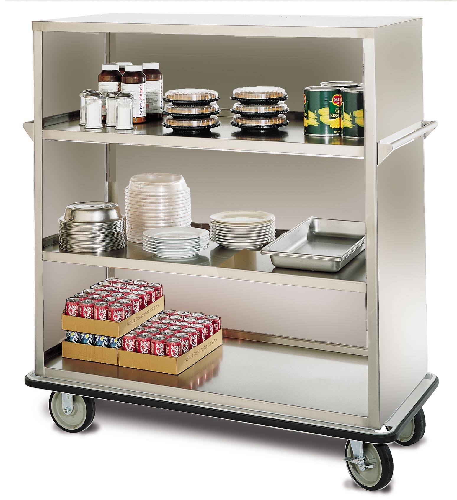 Enclosed Utility Carts – All Stainless Steel, Enclosed on 3-Sides “Super-duty” stainless steel construction enclosed on 3 sides for secure and stable transport. Transport, serve, store or bus with super heavy-duty Queen Mary mobile utility carts. Ideal for protecting less stable items such as dishes during transport or storage. These rugged mobile back-up units are built incredibly tough -tough enough to safely take loads of up to 1600 lbs. Each reinforced stainless steel shelf has over 9.5 square feet of working space – enough to carry three large serving trays. FWE’s utility carts are designed to last longer than any other – period! Welded construction and our exclusive tubular stainless steel base frame ensure that our cabinets will endure the most rigorous operations and environments. Durable stainless steel takes the abuse of transport applications and allows for sanitary maintenance. 8″ heavy-duty casters are mounted to reinforcement plates for added durability and take the impact over threshold. Locking doors or gates are available to secure from theft – making the “UCE” a perfect security transport/storage unit!