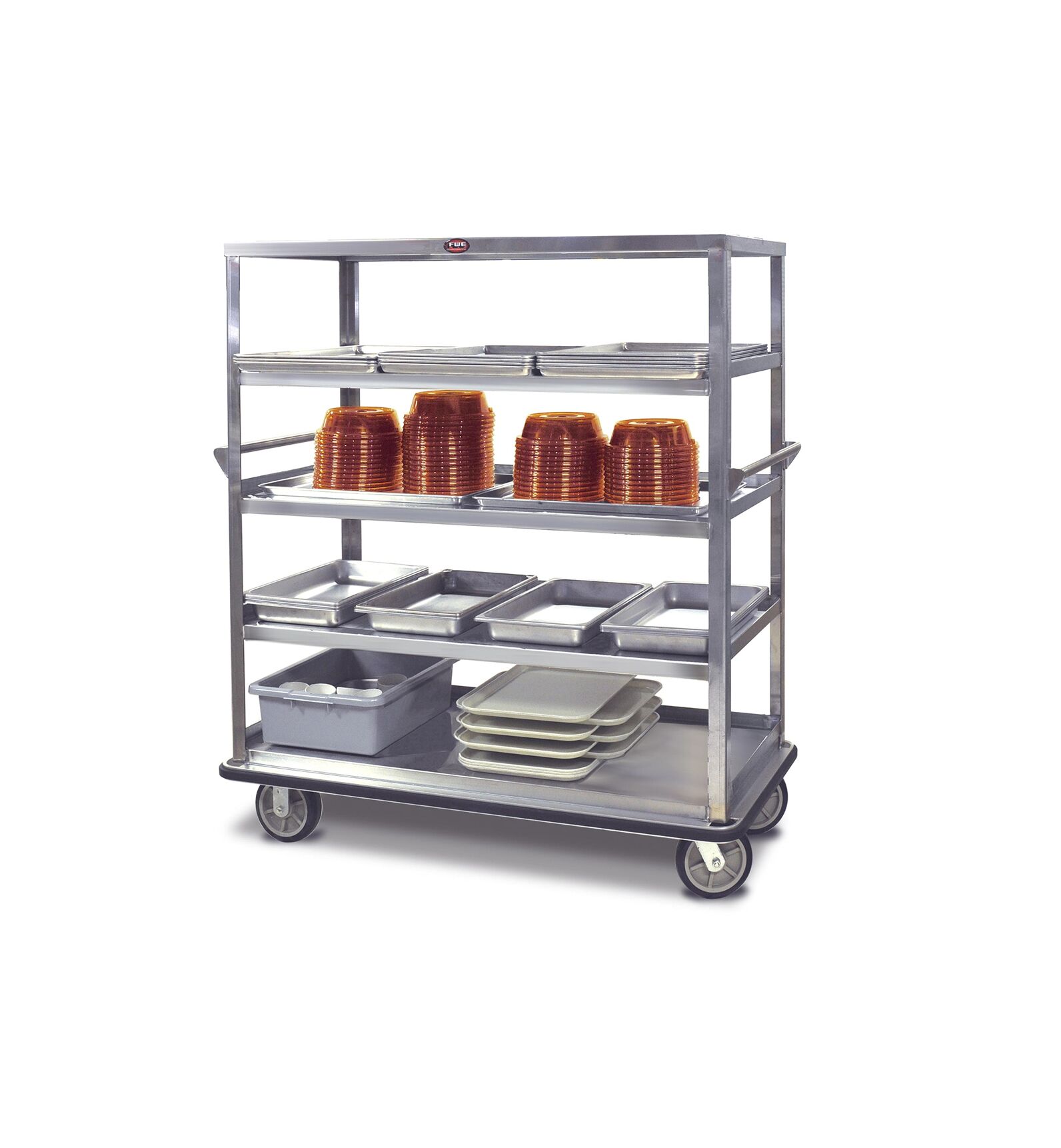 Heavy-Duty Utility Carts – For Multi-Purpose Back-Up Heavy-gauge stainless steel, super tough carts carry 200 pounds per shelf! Transport, serve, store or bus with super heavy-duty Queen Mary mobile utility carts. These rugged mobile back-up units are built incredibly tough – tough enough to safely take loads of up to 1600 lbs. Each reinforced stainless steel shelf has over 9.5 square feet of working space – enough to carry three large serving trays. Edges flanged up. FWE’s utility carts are designed to last longer than any other – period! Welded construction and our exclusive tubular stainless steel base frame ensure that our cabinets will endure the most rigorous operations and environments. Durable stainless steel takes the abuse of transport applications and allows for sanitary maintenance. Super-duty 8″ casters are mounted to reinforcement plates for added durability and take the impact over threshold.